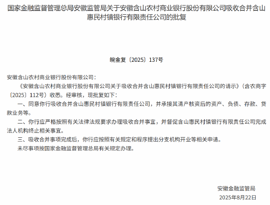 9月1日金融一线消息,国家金融监督管理总局安徽监管局发布《关于安徽含山农村商业银行股份有限公司吸收合并含山惠民村镇银行有限责任公司的批复》,同意该行吸收合并含山惠民村镇银行有限责任公司,并承接其清产核资后的资产、负债、存款、贷款业务等。