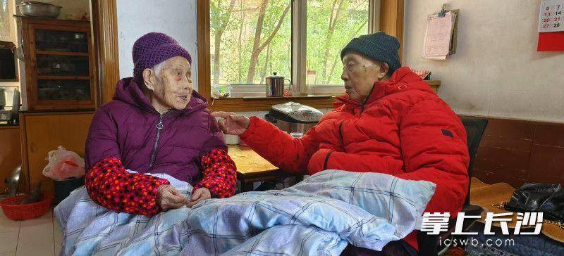 百岁老人牙齿一颗未掉重阳节前夕,10月22日上午,记者来到融城社区中国水电八局南托基地3小区21栋,见到了这对“超高龄”夫妇。“我爸爸出生于1924年12月27日,妈妈比他小两岁,是1926年3月17日出生的……”一进门,63岁的儿子俞国林便热情介绍起父母的情况。当天长沙气温偏低,只有10℃左右,老两口正坐在电火炉旁取暖。俞振藩身穿红色羽绒服,头戴蓝色呢绒帽,面色红润,看上去完全不像百岁老人。据俞国林介绍,父母身体总体健康。两位老人除了听力下降,视力尚可,行动也较自如,生活基本能够自理。母亲谭魁华有一些老年人常见的基础病,而父亲俞振藩不仅没有“三高”,牙齿也保持得十分完好。“我父亲一颗牙都没掉,只是部分牙齿做了加固。”俞国林自豪地说。母亲早年左眼做过白内障手术,目前仅右眼有视力。“每天早晚洗漱都是他们自己完成,不需要帮忙。”家中阿姨补充道。老两口饮食清淡,没有太多特/span>“我吃也吃得,做也做得……”正在吃麦片粥的谭魁华似乎听到谈话,轻声自语。吃完粥,她又接过儿子递来的、削好的两瓣苹果,并随手分了一瓣给老伴。
