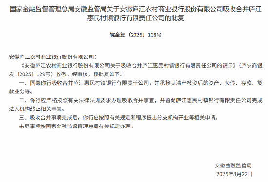 9月1日金融一线消息,国家金融监督管理总局安徽监管局发布《关于安徽庐江农村商业银行股份有限公司吸收合并庐江惠民村镇银行有限责任公司的批复》,同意该行吸收合并庐江惠民村镇银行有限责任公司,并承接其清产核资后的资产、负债、存款、贷款业务等。