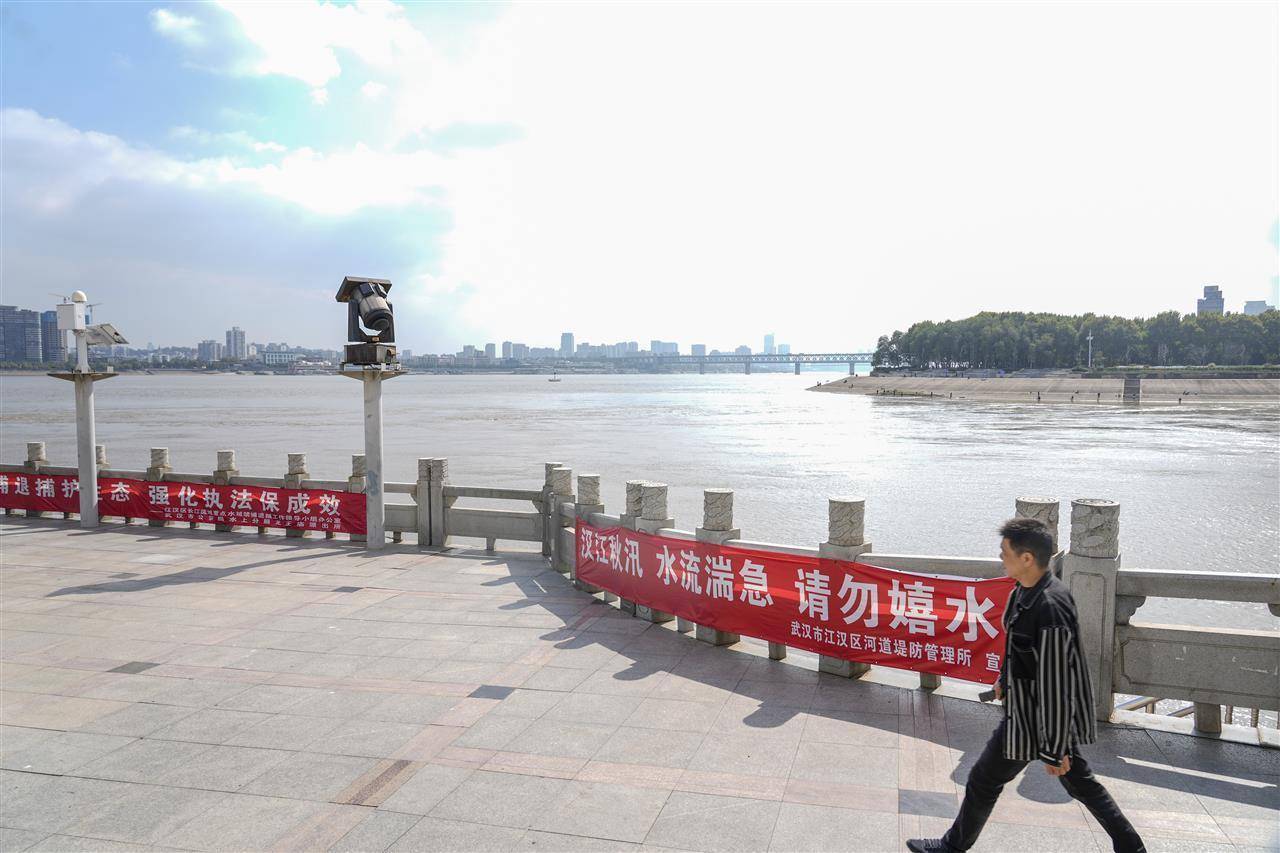 10月22日,汉江、长江武汉龙王庙交汇处,水流湍急,武汉水务部门已关闭了亲水平台通往江面的阶梯,堤防广播滚动播放劝告市民游客不要下水游泳。据悉,9月以来,长江、汉江上游发生多轮降雨,秋汛来势汹汹。