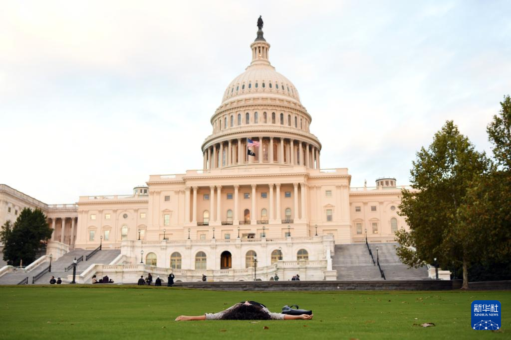 10月15日,在美国华盛顿,一名女子躺在国会大厦前的草坪上。新华社记者 李睿 摄