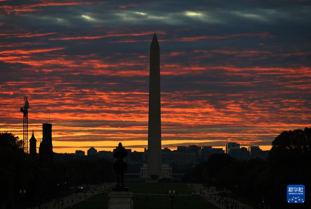 这是10月15日拍摄的日落时分的美国华盛顿纪念碑。新华社记者 李睿 摄