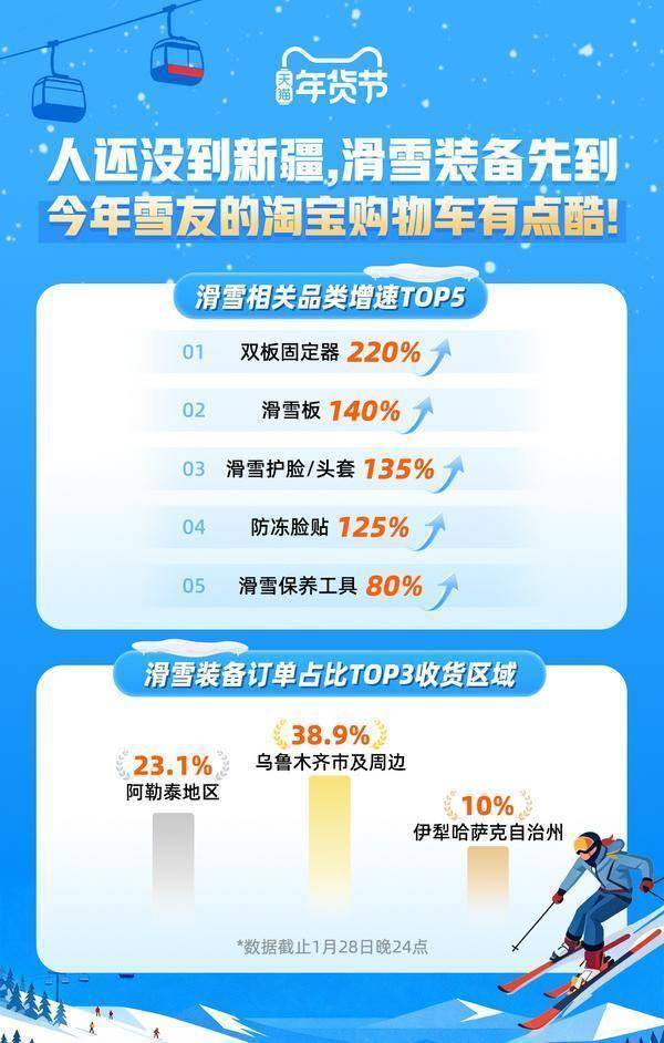 这个天猫年货节,去新疆雪原滑雪成消费“热动力”。随着春节临近,冰雪旅游热度持续攀升,直接带动了“异地网购热”。不少计划前往新疆滑雪的游客,选择“装备先行”——通过淘宝天猫提前购置滑雪装备,直接寄往目的地,成为今年年货节独特的消费风景。“过去来新疆滑雪,要么自带沉重装备,要么在当地高价租赁,选择有限。现在新疆也包邮,可以提前在淘宝慢慢挑,直接寄到雪场酒店,人到了就能开滑,方便多了!”计划春节赴阿勒泰滑雪的上海游客李女士说道。和她一样,很多年轻人都选择了这样“轻装出行,装备先行”。雪友们在天猫年货节上正火热下单。大家的购物车里到底装了些什么?来自北京的马女士分享了自己的购买顺序:“滑雪板、滑雪鞋和雪杖这种大件笨重的,肯定最先买。淘宝上选择很多,从入门款到专业级都有,自己带个行李箱装衣服就行。”除了基础装备,头盔、雪镜、手套这“护脸三件套”几乎人手一套。年轻消费者不光注重性能,也对滑雪装备的颜值和色彩搭配有明确偏好。“没有什么比在雪场上出片更重要!”95后雪友小林说。得益于淘宝在新疆实现全面包邮,数据显示,年货节启动以来,今年滑雪类商品在新疆地区销量爆发。滑雪板、滑雪头套、双板固定器、防冻脸贴等核心装备订单量同比增长120%以上,其中滑雪板类目同比增长140%;滑雪鞋、手套、雪杖等相关品类也同比增长50%以上。值得注意的是,大量订单收货地址为酒店、民宿或雪场寄存点,“轻装出行、装备前置送达”正成为越来越多消费者的新旅行方式。