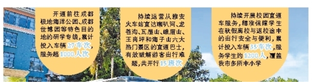 秋假期间,许多家长带孩子亲近自然,我市各景区人气爆棚。四川蜀通运业有限责任公司迅速响应,优化交通路线,持续运营从雅安火车站直达喇叭河、龙苍沟、瓦屋山、峨眉山、王岗坪和海子山六大热门景区的直通巴士。通过“一站直达”模式,有效破解游客出行难题,共开行15班次大巴,为学生和家长秋季旅游提供高效便捷的交通支持,赢得市民和游客广泛赞誉。